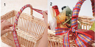 选一条长的丝带在竹筐的提手上打上漂亮的蝴蝶结,这样,简洁而有新意。